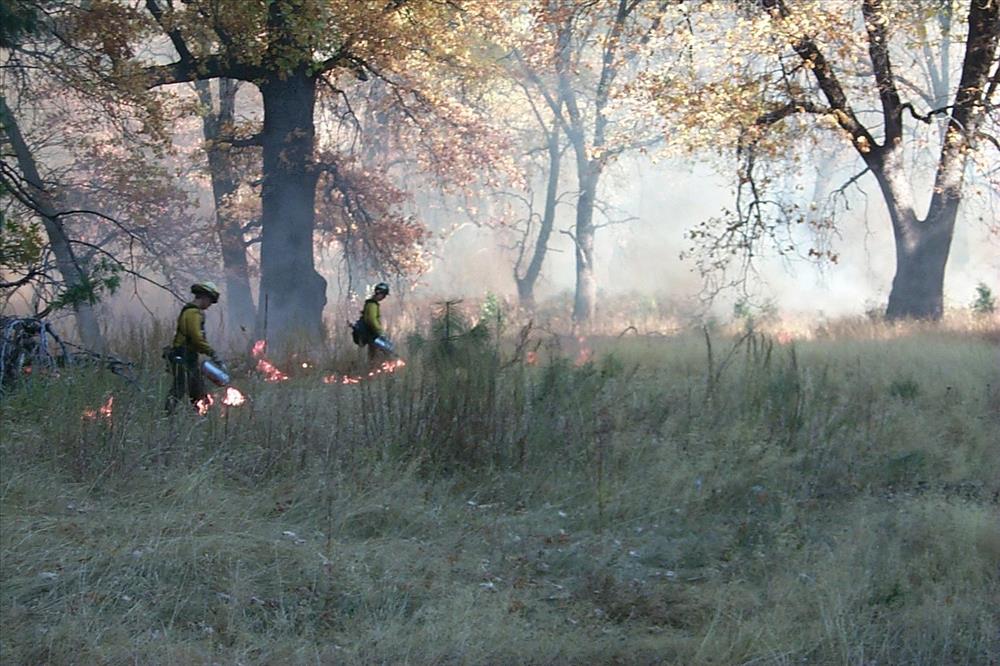 Crews using drip torches to ignite El Capitan prescribed burn, 2000, Yosemite National Park