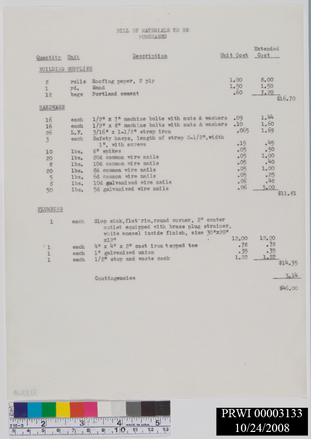 SHELTER, CRAFT. CAMP 3. JOB #270.<CRCAMP 3. INCLUDES JUSTIFICATION, SPECIFICATIONS. JOB APPLICATION & COMPLETION RECORD. MAN D<CRREVISIONS. MATERIALS LOCALLY PRODUCED AND PURCHASED. DISCRIPTION AND COST. MATERIALS FROM<CRFROM OTHER SOURCES.<CR#, THRU , SAME FILE FOLDER. CAMP 3. CORRESPONDENCE. REDUCTION OF CONTOUR LOCATION MAP.<CRSTAPLES, RUST, CARBON TRANSFER. YELLOW PAPER. TORN.