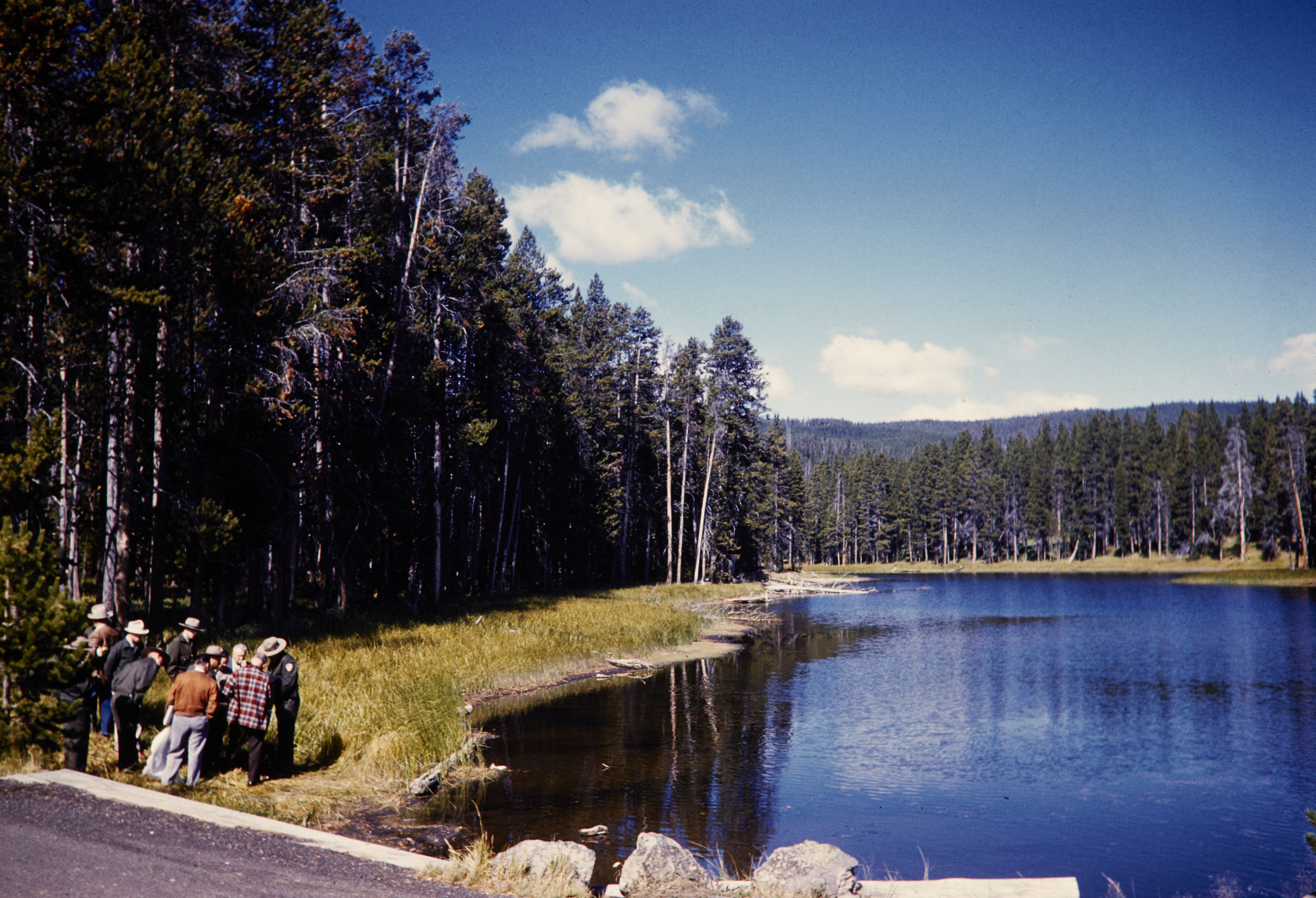 NPS director Conrad Wirth talking with a group of men by a lake in Yellowstone National Park.