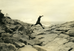 SURF CRASHING AGAINST ROCK. MAN LEAPING WITH A CAMERA IN HIS HANDS.