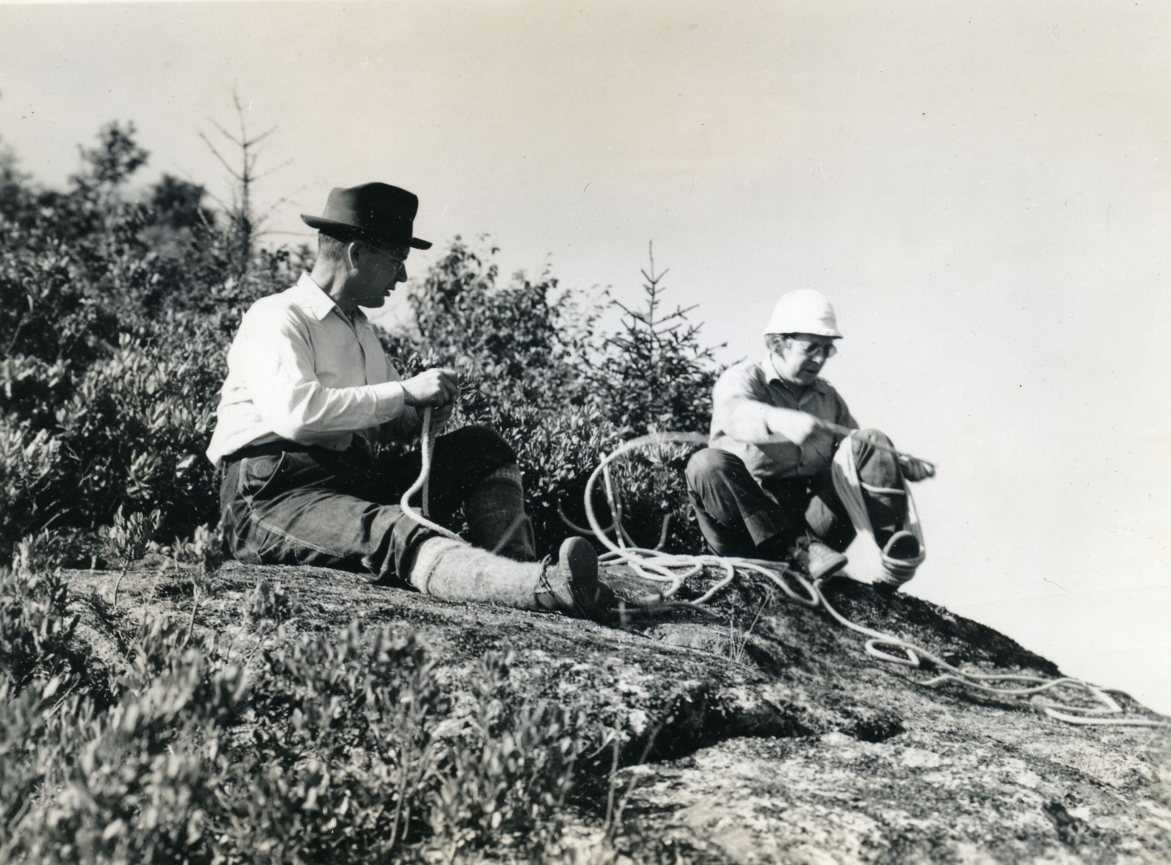TWO PEOPLE AT TOP OF ROCK WALL, WRAPPING UP THE ROPE.