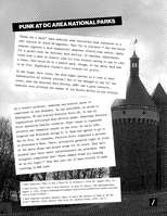 A black banner with white font reading “Punk at DC Area National Parks.” Boxes of white with black typewriter font. Black and white stippled photograph of Tenleytown Water Towers in the background.