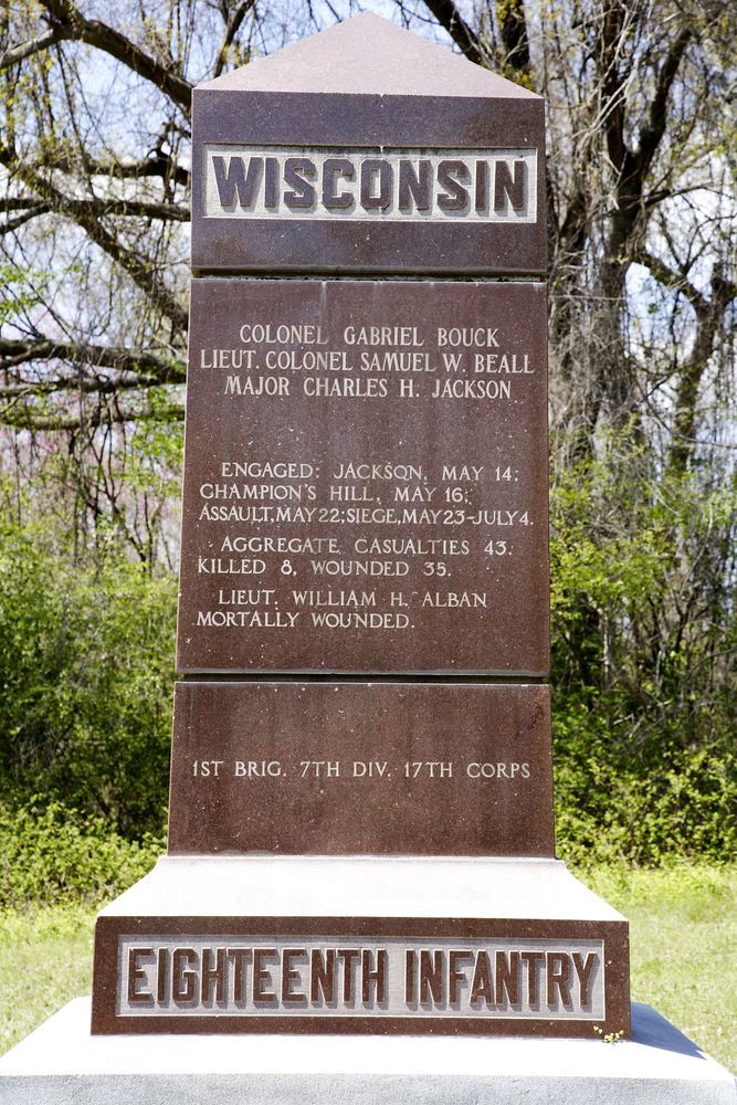 10' x 10' x 11' high obelisk of polished red Montello, WI, granite on 2-step base of gray Barre, VT, granite. Shaft composed of 3 stones with raked joints. Pedestal has unit designation; campaign record in middle; WISCONSIN at top.