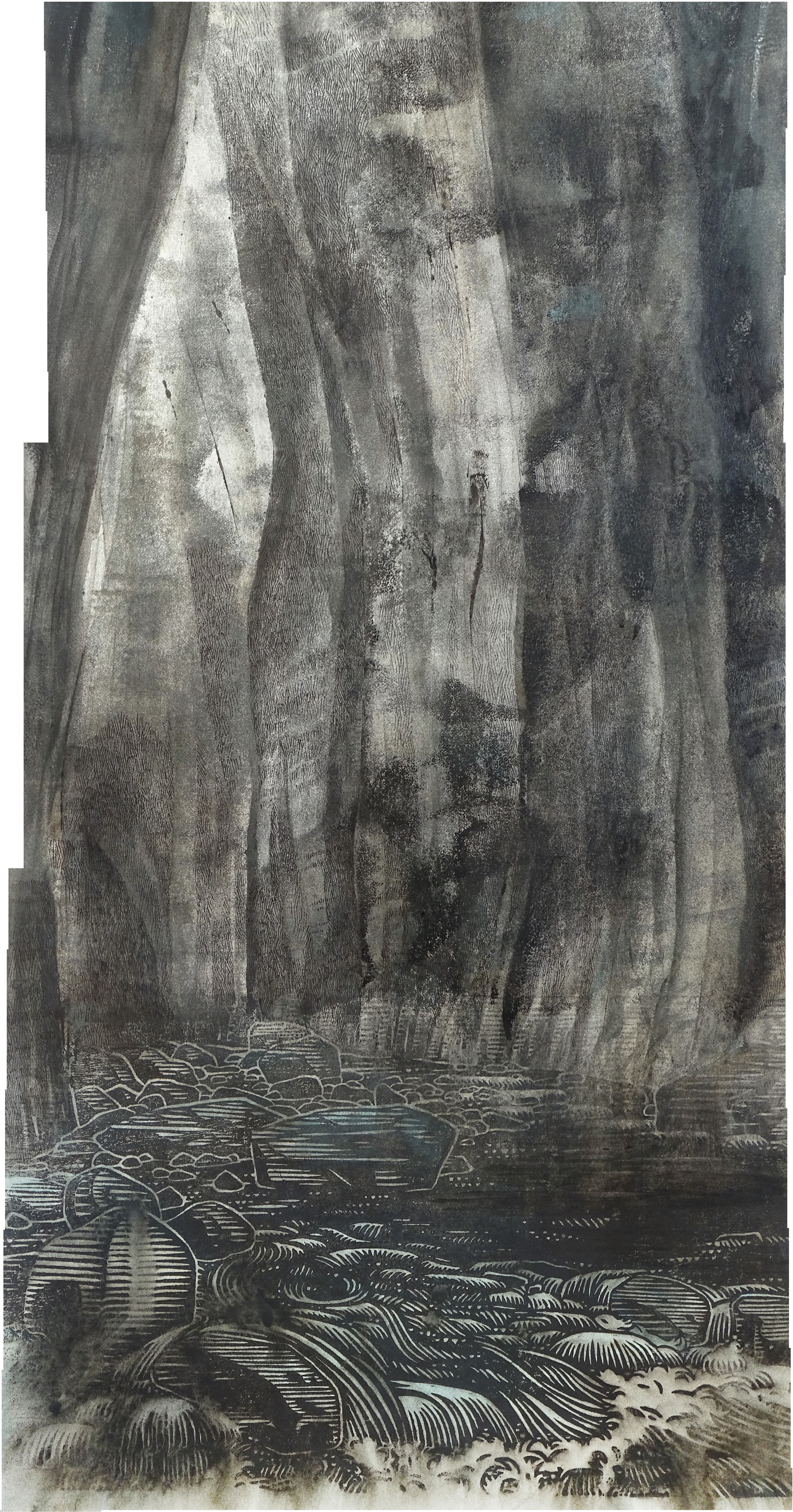 A black-and-white image with hints of blue color, made by printing ink on paper. In the foreground, water rushes between boulders, creating splashes and rapids. Above the water, tall gray sandstone cliffs rise to form a narrow canyon. They lean towards the center of the canyon as if they will merge in the middle.