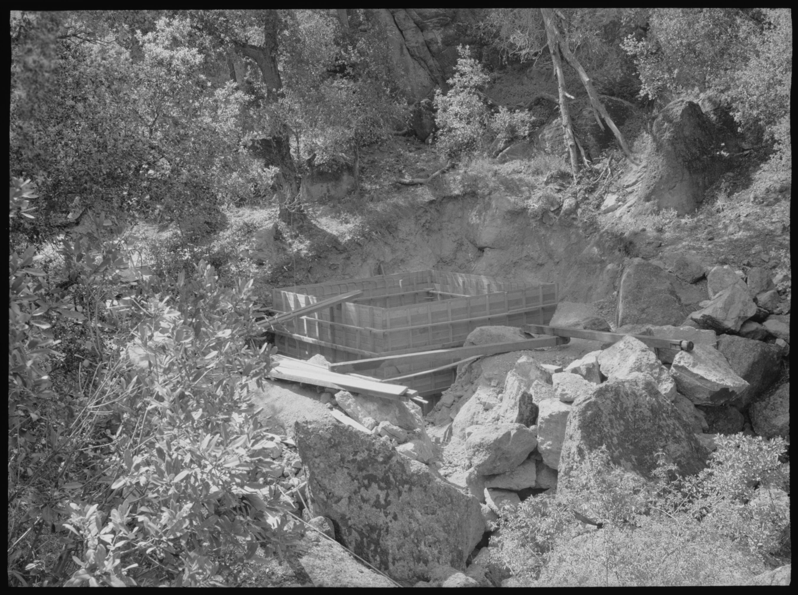 Concrete forms for unidentified structure for Bear Gulch Dam construction.