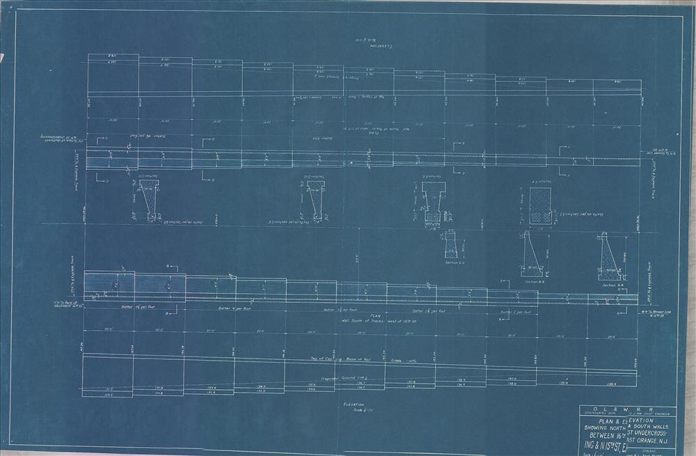 022 East Orange Improvements--Plan and elevation showing north and south walls between 16th Street Undercrossing and North 15th Street--East Orange, NJ [1921.09.20] Sheet no. 08