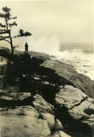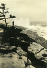 SURF CRASHING AGAINST ROCK. MAN STANDING ON ROCK, POSSIBLY DRESSED IN NATIONAL PARK RANGER UNIFORM.