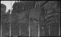 Group of CCC enrollees posing above stonework.