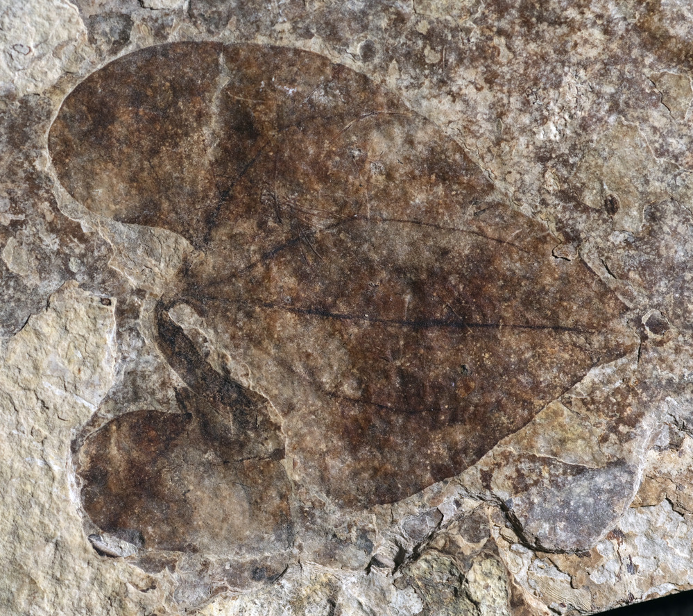 A fossil leaf approximately 4.4 cm long. Catalog number FOBU17514.