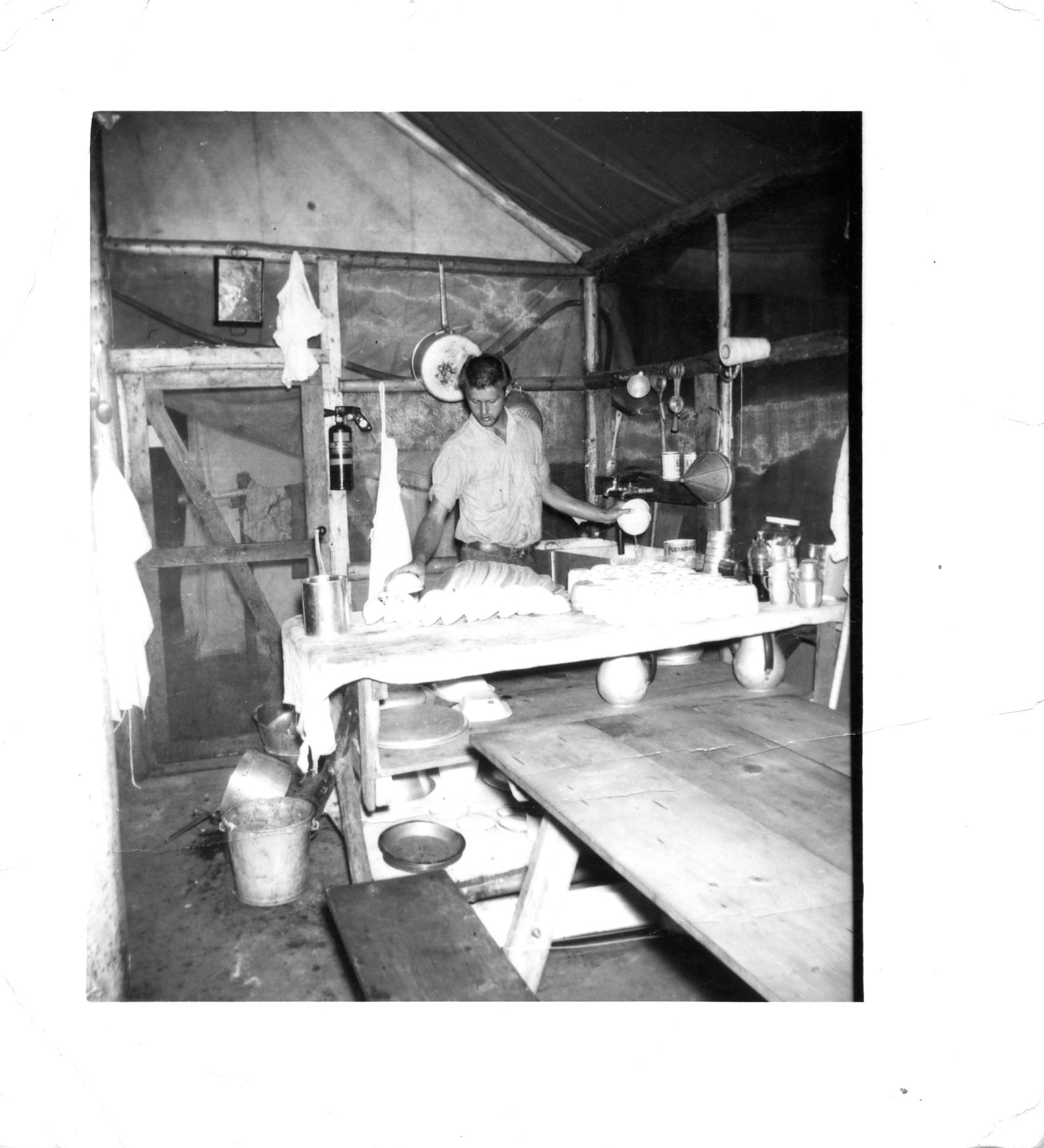 Donald Jonas Historical Photograph Collection:Blister rust control crew worker washing dishes in camp mess, YOSE