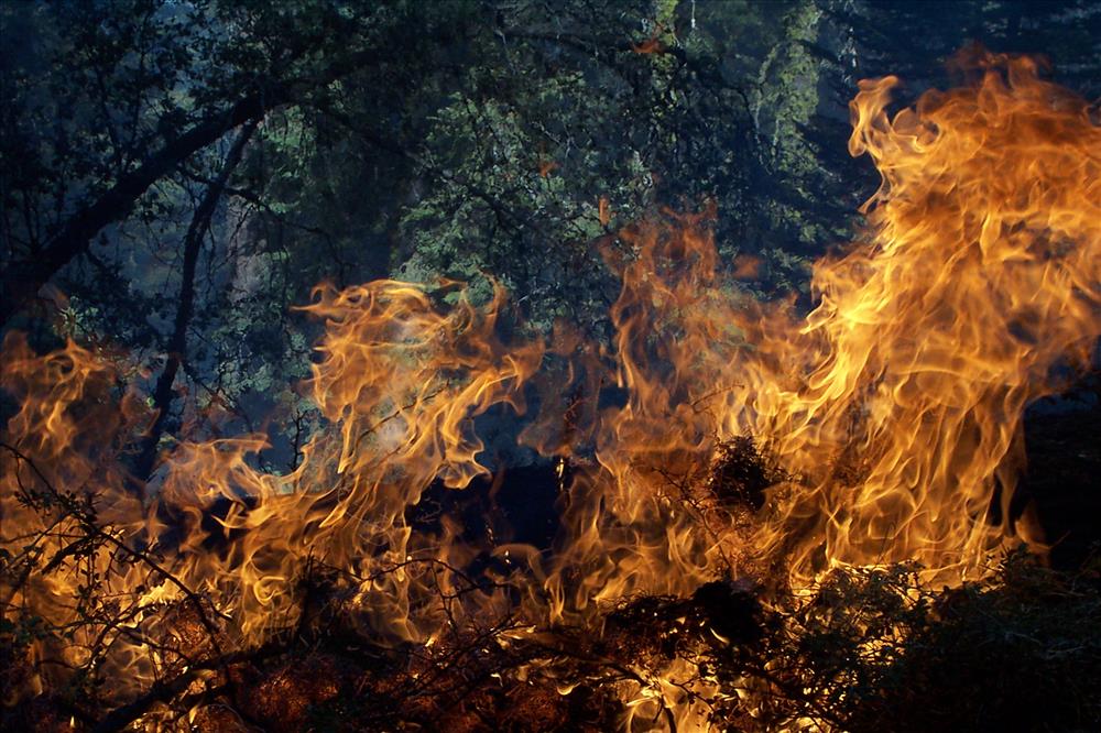 Sunset prescribed burn in Grant Grove, Sequoia and Kings Canyon National Parks, fall 2002