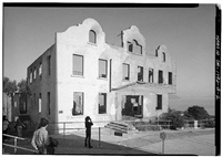 2 stories, brick chimneys, fireplaces, hand railings, lighthouses, parapets, people, ruins
