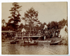 People gathered to watch production of the "Hiawatha Pageant" near shore of Lake Huron. People in boats in the foreground, people standing on a wooden bridge in middle ground, and trees and tipis in background.