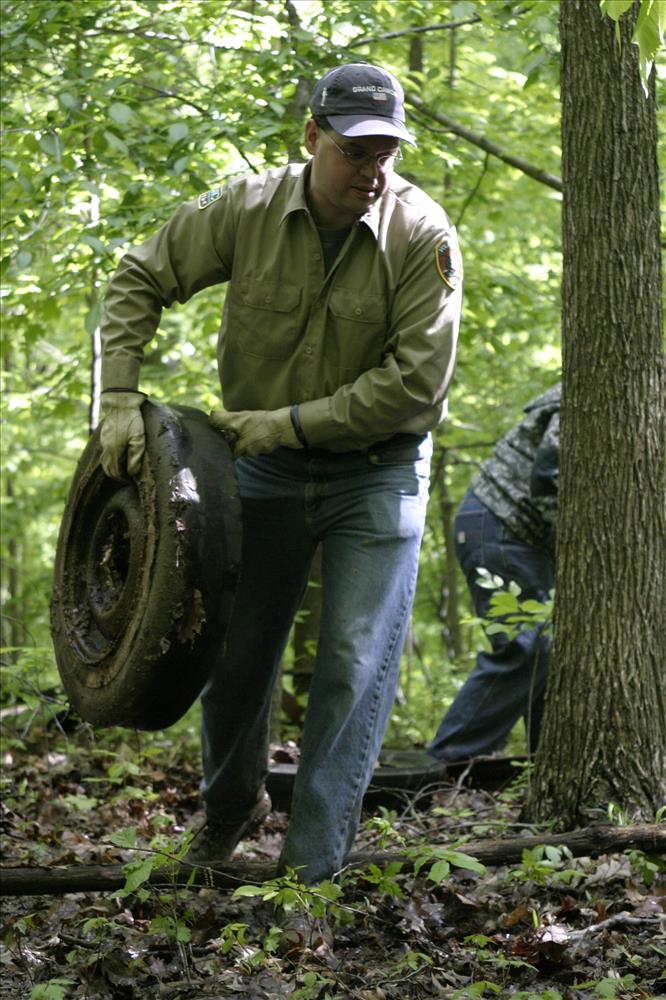 RiverDay is an an annual day of service and celebration in the Cuyahoga Watershed. Activities are coordinated by Friends of the Crooked River. Cuyahoga Valley National Park is a partner. Our volunteers remove trash from dump sites in several locations and invasive plants from the area around Howe Meadow. || Cuyahoga Valley Trails Council volunteers act as crew leaders at one of several trash dump sites on RiverDay 2006.