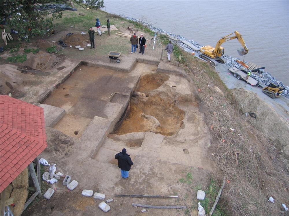 Project included raising the level of riprap around the shoreline of the bluff, constructing an eight foot wide path around the toe of the bluff, constructing a concrete cell wall at the base of the slope, and regarding the top thirty feet of the bluff. The repairs were concentrated along a section of fluff located along the northwest corner of the unit. The repairs generally included raising he height of approximately 650 feet of the existing riprap revetment along the shoreline of the two rivers; removal of vegetation and loose and unstable soil from the toe and face of the bluff; constructing a 450 foot long low height pre-cast concrete retaining wall at the base of the bluff; and then backfilling behind the wall and against the existing slope with an open graded coarse aggregate to control drainage. The top of the wall was built to elevation 16 feet NVGD. A geotextile was used as a filter media to separate the natural soils from the coarse aggregates. The finished slop behind the wall was maintained at a 2 horizontal to 1 vertical slope. An additional 890 tons of riprap was added to the height of the revetment along the project shoreline and thereby provide additional storm protection to the area. The area between the revetment and the retaining was backfilled and a small path was maintained between the toe of the wall and the riprap revetment for public and park access. The finished slope was covered with a geo-cell geo-textile which was filled with topsoil and seeded.