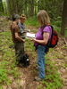 Three people on a forested trail look at ID books.