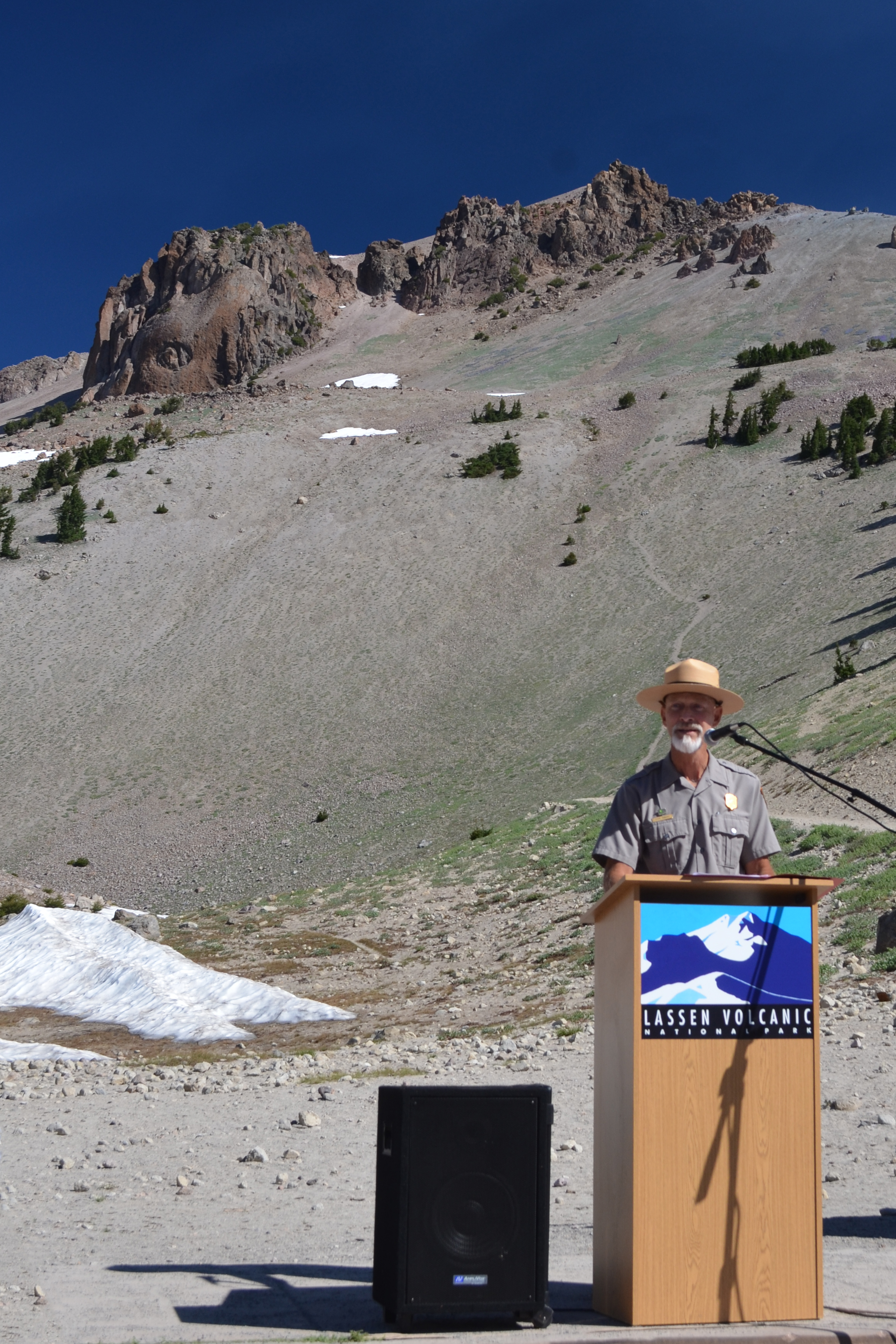 Superintendent Steve Gibbons speaks at the Reach the Peak Official Trail Dedication at the Lassen Peak parking area. Lassen Peak in background.