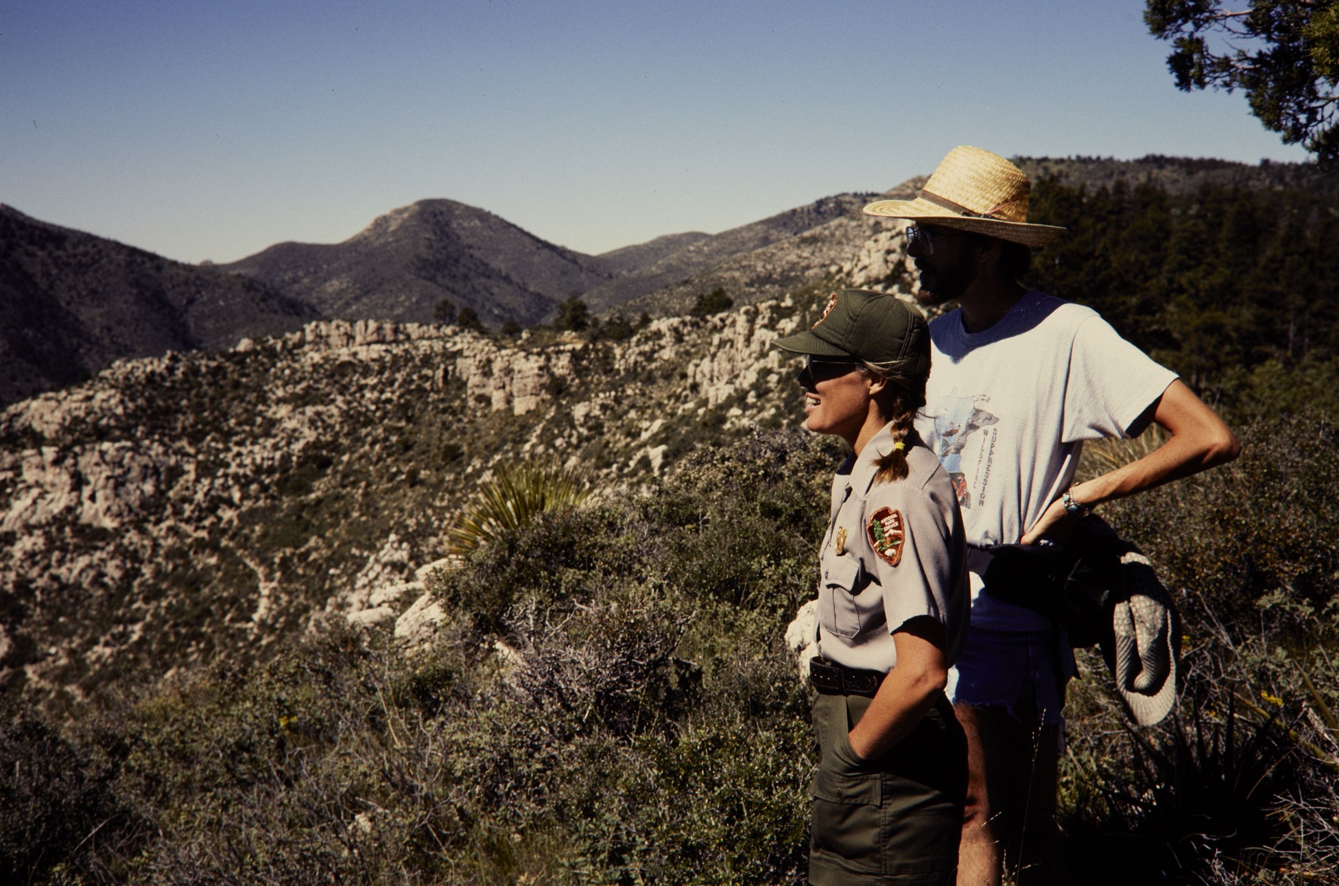 HFCA 1607_People Volume 2_360.jpg. NPS seasonal employee Nevada Barr standing with a man looking toward the mountains in Guadalupe Mountains National Park. Exact date of image is unknown but is likely c. 1990 (late 1980s-1994).