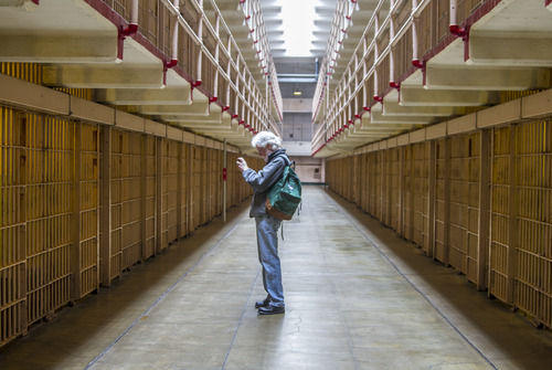 Visitor photograhing in the main cell block, Alcatraz, 2011