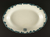 Harriman blue china, serving platter, heavy white china with bluemarking around rim used for the Union Pacific/Utah Parks dining operations, Union Pacific overland logo on upper edge of plate. One medium chip out of rim with a 2" spider crack running from chip, a few discolored spots and scratches from use of utensils. Maddock American china imprinted on bottom. 11" diameter x 7-5/8" wide x 1-3/16" high. Donated by Carl Croft