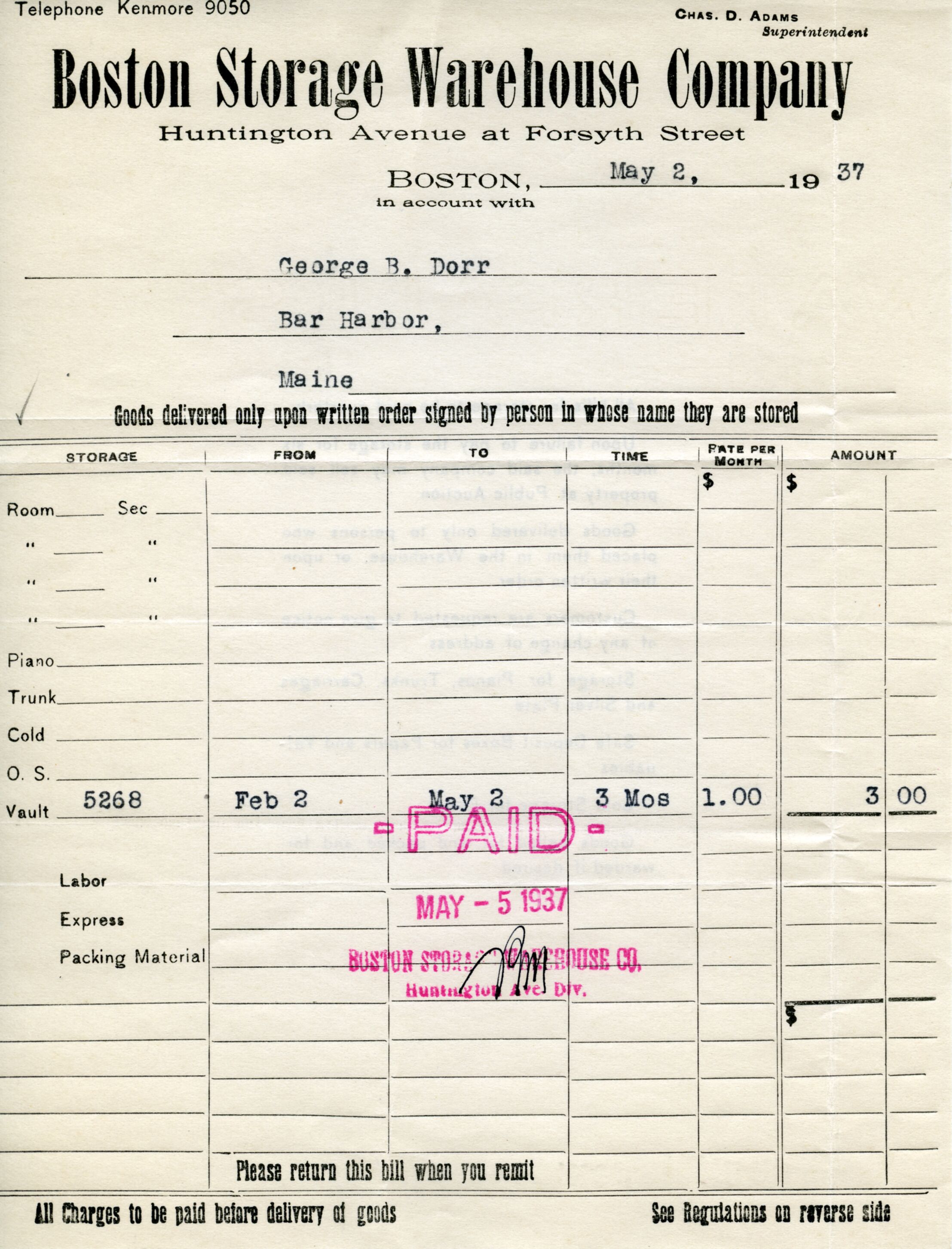 Receipt from the Boston Storage Warehouse Company to George B. Dorr for use of the vault from February 2 to May 2, 1937. Paid May 5, 1937. See following entry for sample of back of receipt: "Receipt, BostonStorageWarehouse to Dorr, July 27, 1937 p.2.tif"