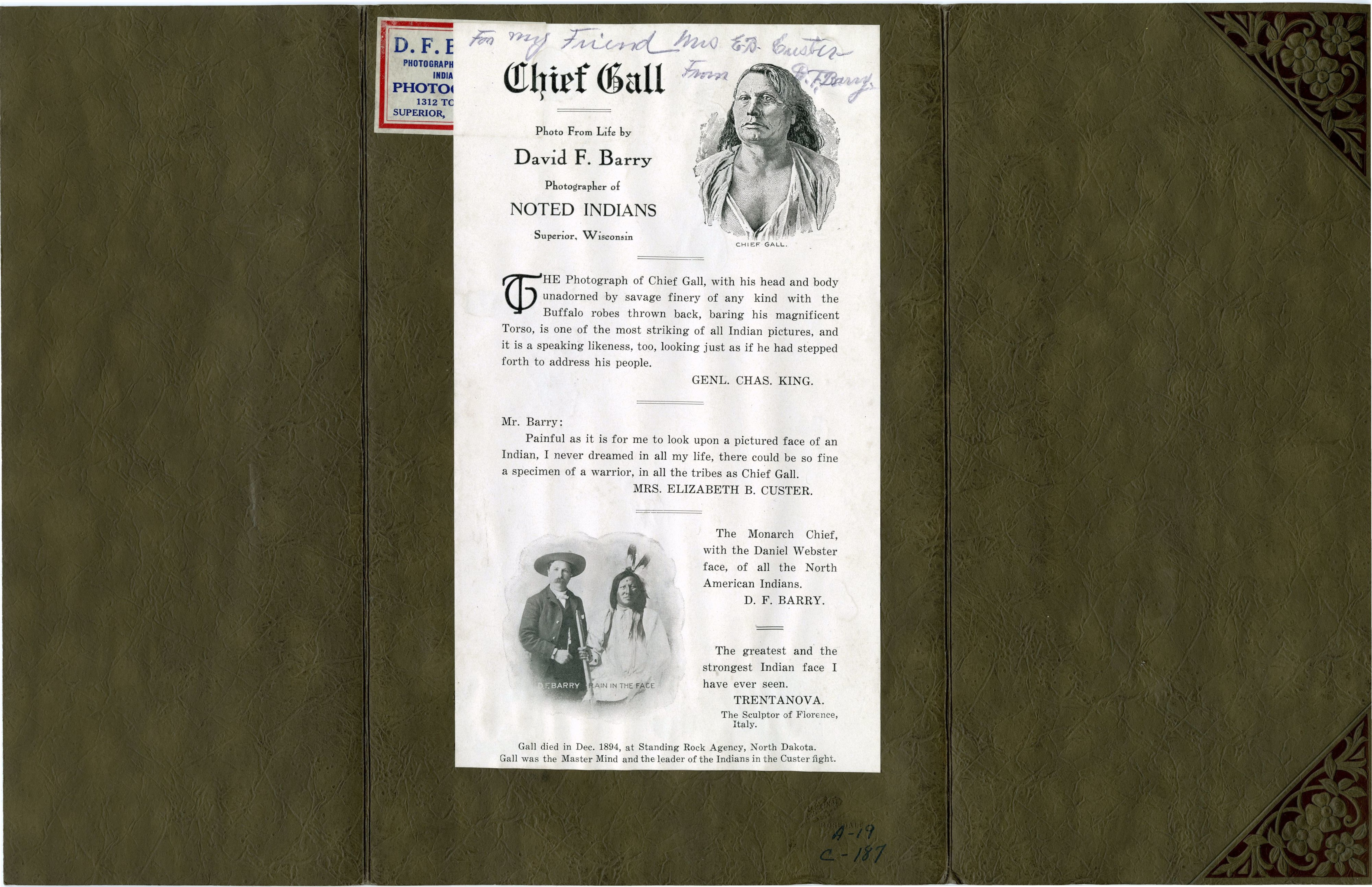 LIBI_00019_00187; This item is a card-mounted photograph of Chief Gall and a nephew. The full view photograph is 4 1/2 x 6 1/2" mounted in a folder (10 7/8 X 17" open) and was produced circa 1880 by David F. Barry. On the front, "Gall" is typed on a label and adhered to the photograph. "Copyrighted by D.F. Barry" is printed on the lower right edge and "Barry Photo" is written in white ink on the image. On the verso, there is a drawing of Chief Gall and a copy of a photograph of D.F. Barry and Rain in the Face with comments by General Charles King, Elizabeth B. Custer, David F. Barry and Trentanova. A handwritten notation reads, "For my friend, Mrs. E.B. Custer from D.F. Barry." ; PRINT, PHOTOGRAPHIC [With folder mount]; Courtesy of the National Park Service, Little Bighorn Battlefield National Monument, LIBI_00019_00187, D. F. Barry, "Chief Gall and His Nephew," circa 1880