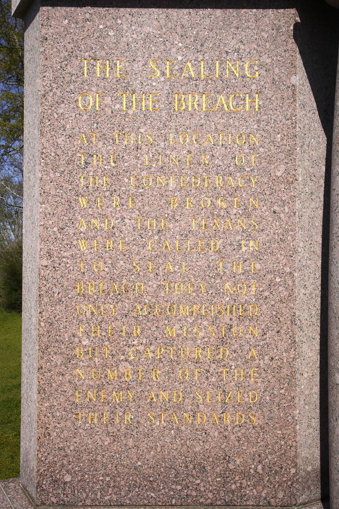 27' x 27' x 14' overall monument is on platform reached by 11 steps and backed by a Doric colonnade, all of red Texas granite. On platform is a 20" x 24" x 84" bronze soldier with a rifle perched on a cannon barrel. Live yucca plants.