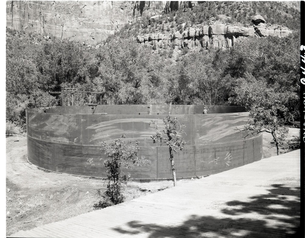 Construction of million gallon water tank at Birch Creek, with welding crews working on walls. ; ZION Museum and Archives Image 006_04_080 ; ZION 15933