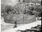 Wooden scaffolding and workers used for upgrade of water system at Temple of Sinawava. ; ZION Museum and Archives Image 006_04_159 ; ZION 15933