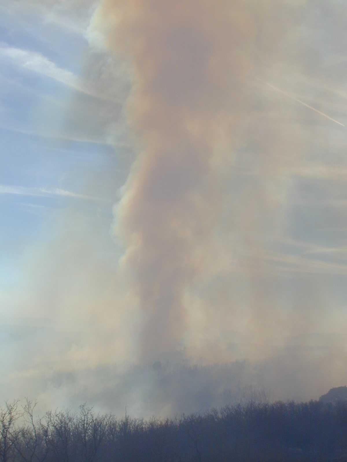 Smoke patterns during the Far View prescribed fire, November 2001. Throughout most of the day, smoke production was light to moderate on Burn Unit 2, and drifted to the northwest. Heavy smoke was observed when large oak thickets burned, forming a plume that rose to at least 1500 feet. Dispersal was generally good throughout the burning period. Fuels were lighter on Burn Unit 1, producing light smoke that drifted to the northwest and rose no higher than 200 feet. Around 1600, as upslope winds began to shift downslope, dispersal started to become poor. After 1700, downslope winds began to carry smoke into Soda Canyon from all parts of the burn.