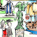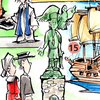 Cartoon drawing of a green statue of a man standing on a turtle wearing a necklace with an eagle perched on his shoulder.