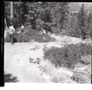 Dirt road from Potato Hollow to Kolob Creek, bulldozer graded road section on park land, several park employees inspect road. ; ZION Museum and Archives Image 101_02_011 ; ZION 8309