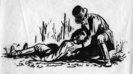 Man in civilian dress wearing a stovepipe hat assisting an unidentified, wounded Civil War soldier lying on the ground.