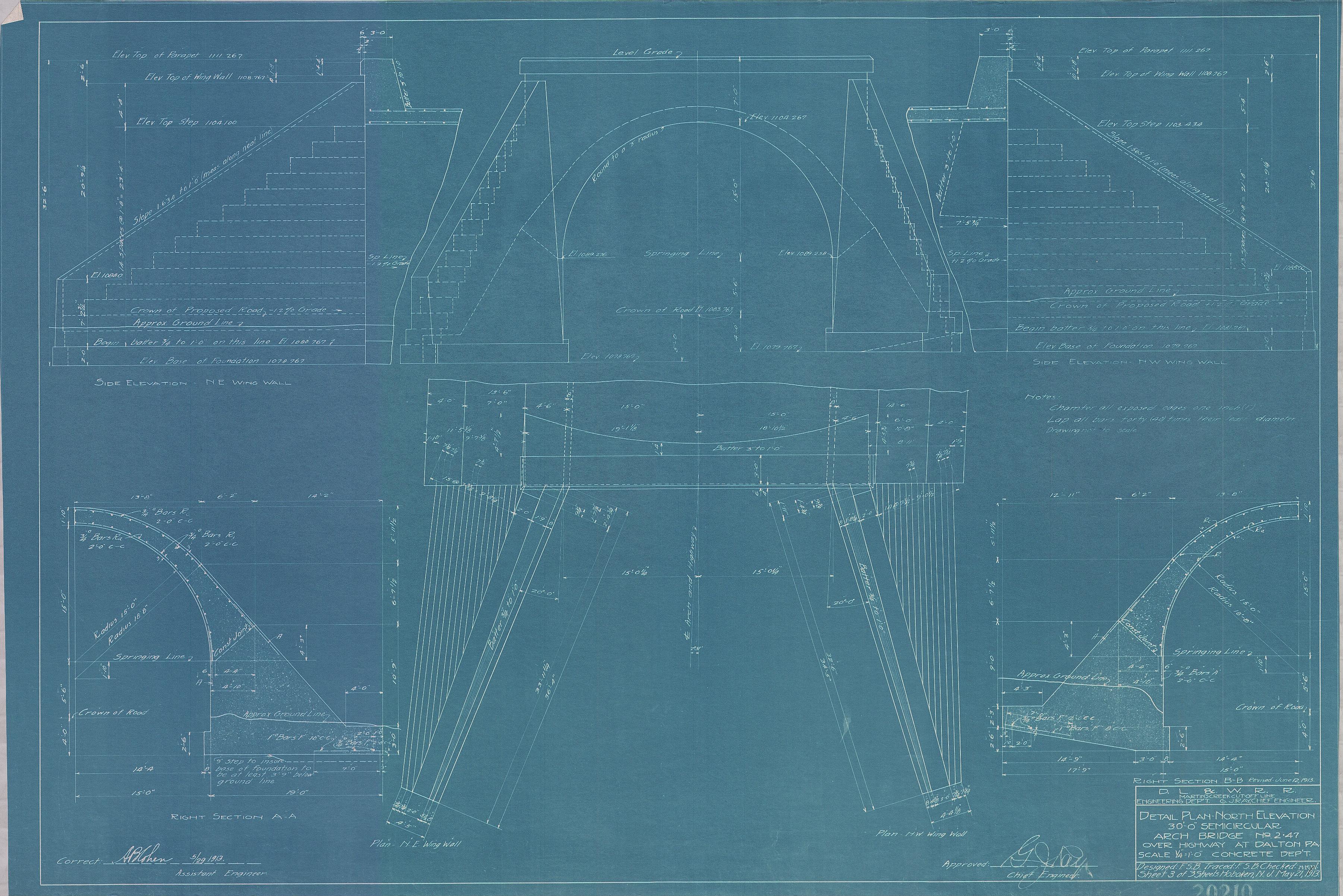 30-foot semicircular arch bridge no. 2.47 over highway--Detail Plan and north elevation--Dalton, PA [1913.05.21] Martins Creek Cut-Off Line--Concrete Department--Sheet no. 3 of 3--Revised June 12, 1913