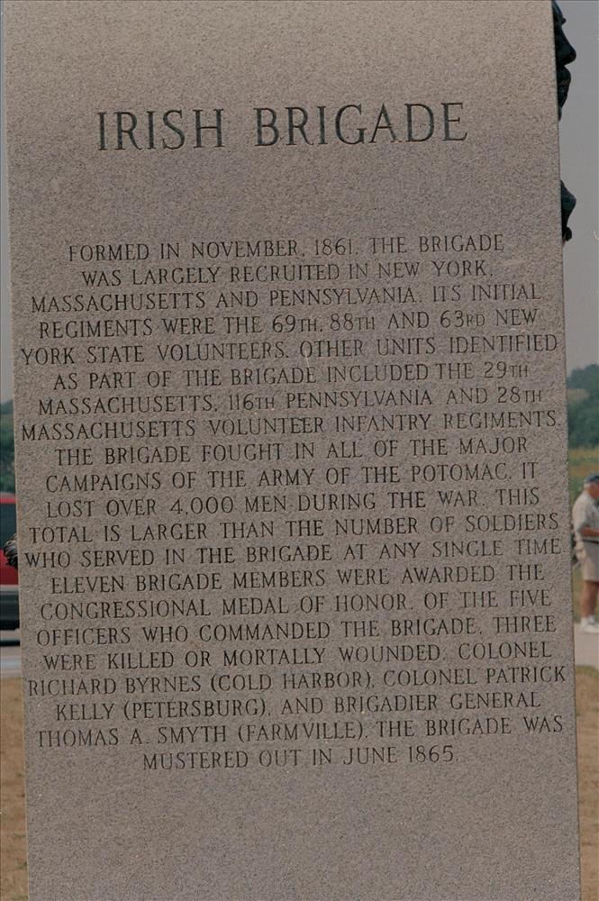 IRISH || Monument consists of large block of County Wicklow (Ireland) granite with rounded top on which is bas-relief panel showing 69th NY color guard in action on front and rondel bas-relief bust of Gen. Meagher on reverse. Adjacent to observation tower. || Built in 1996; sculpted by Ron Tunison