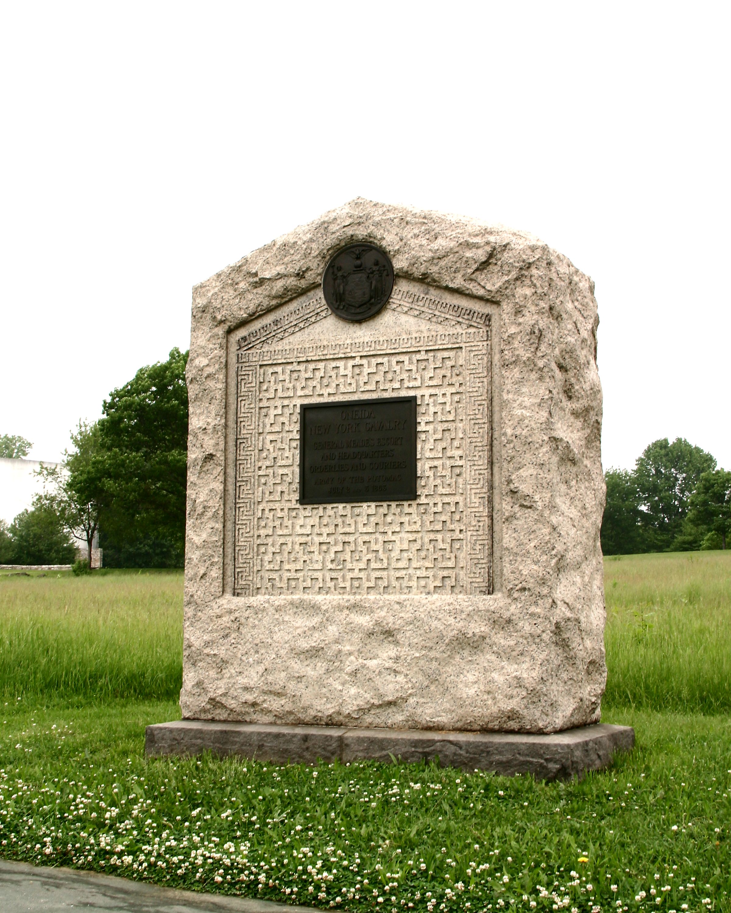 1 of 90 Monuments to New York. Monument to Meade's bodyguard troop. Located W side Taneytown Rd, N of Leister House (Meade's Headquarters). || MN base 7'7"x3' of rough cut stone. Shaft rough cut stone w/gable peak. Front incised w/excised greek key motiff, center bronze tablet, at peak is bronze medallion. All 13'9" H.