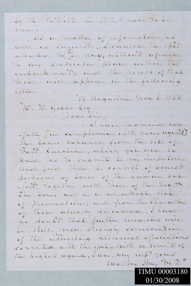 Letter with envelope addressed to "Columbus Drew Esq: Jacksonville, Florida" from "K.B. Gibbs M.S," written in St. Augustine, Florida, September 27, 1856. Letter written in black ink (now brown & slightly burned into paper) on blue, lined paper. Envelope handmade with same paper, ink, & a red seal made with signet ring (part of seal now missing). Letter 2-1/4 pages & concerns info on history of Florida that Gibbs sending Drew. Contains 2 sheafs copied extracts & 1 page letter marked "private."