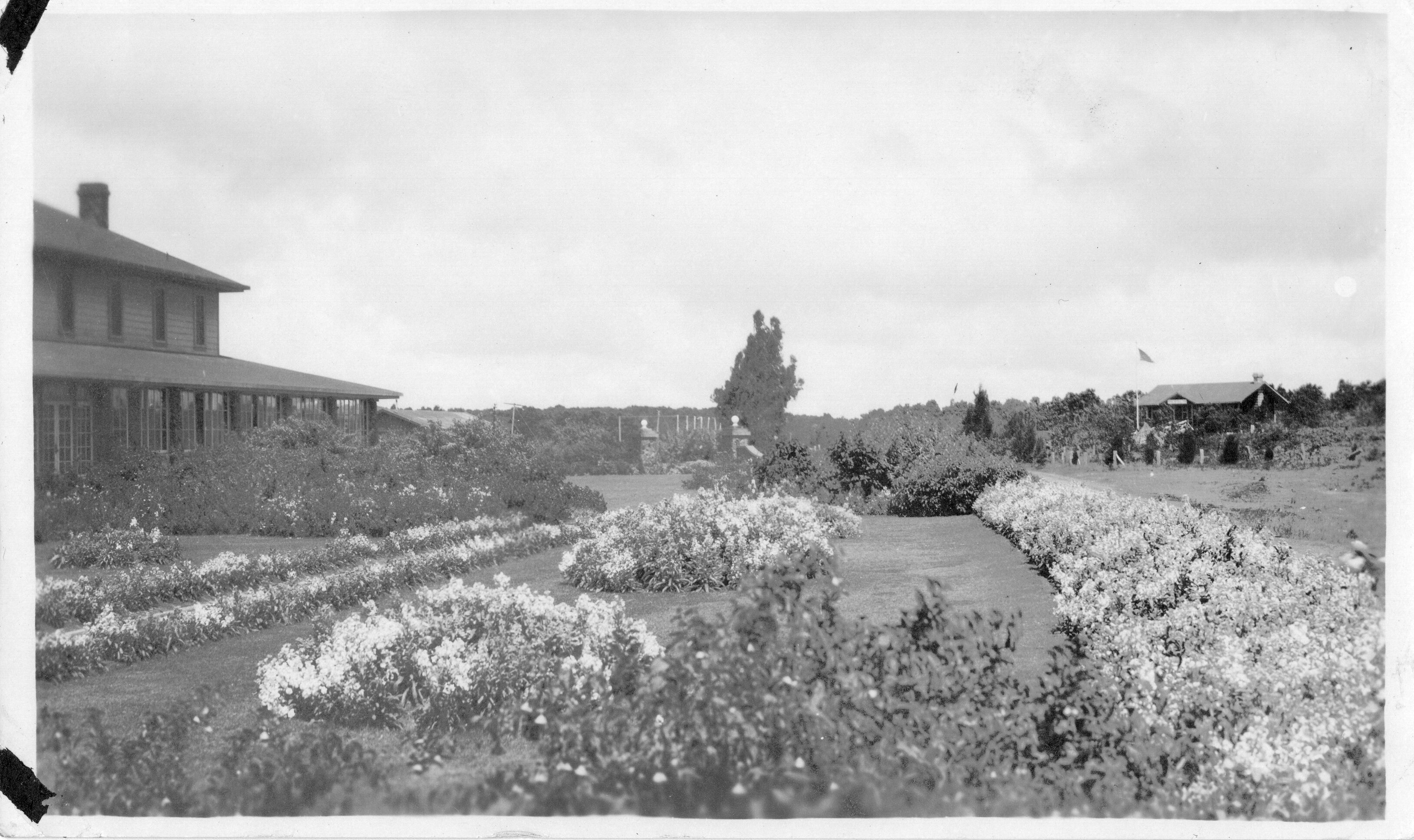 The image is in black and white. There is a two-story building with a large porch in the left of the image. At the center of the right edge of the photo, a one-story office building sits, a flagpole and flag waving out front. Between the two distant structures, in the center of the image, are two rock gate posts. A tall tree sits behind the post on the right. A large lawn fills the foreground and middle ground of the image, the short grass broken up by rows of flowering bushes and hedges. The tops of trees, likely a forest, is partially visible in the background. The sky is cloudy.