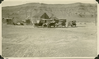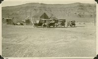 Four automobiles parked near wooden structures, possibly in Bonnie Clare, Nevada. Circa 1919, the year Johnson took or had someone take many photographs prior to construction. Inscription in black ink, lower left corner: 1003. 1003 refers to historic photograph numbering system. Black and white, 6x7 inch, horizontal format. Corner mounted in photograph album.