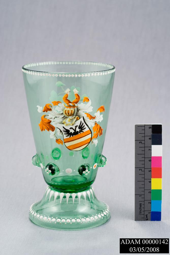 VASE. BOHEMIAN GREEN GLASS VASE ENAMELLED WITH COAT-OF-ARMS, WITH STYLIZED FOLIAGE OVERALL, WITHIN BEADED EDGES. ON MARBLE TABLE.