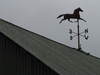 A red horse weather vane sits atop a dark green rooftop.