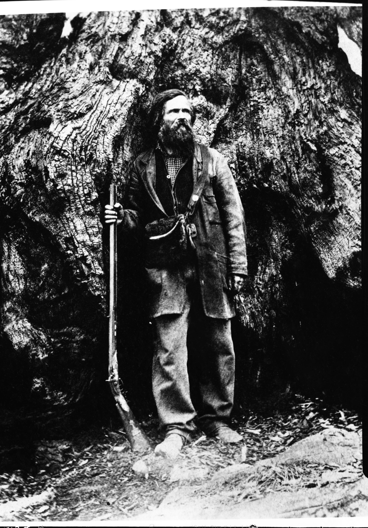 Galen Clark as a young man standing beside Grizzly Giant in Mariposa Grove. Copied from stereo from LA museum. Dated early 1860's, but likely 1858-1859.