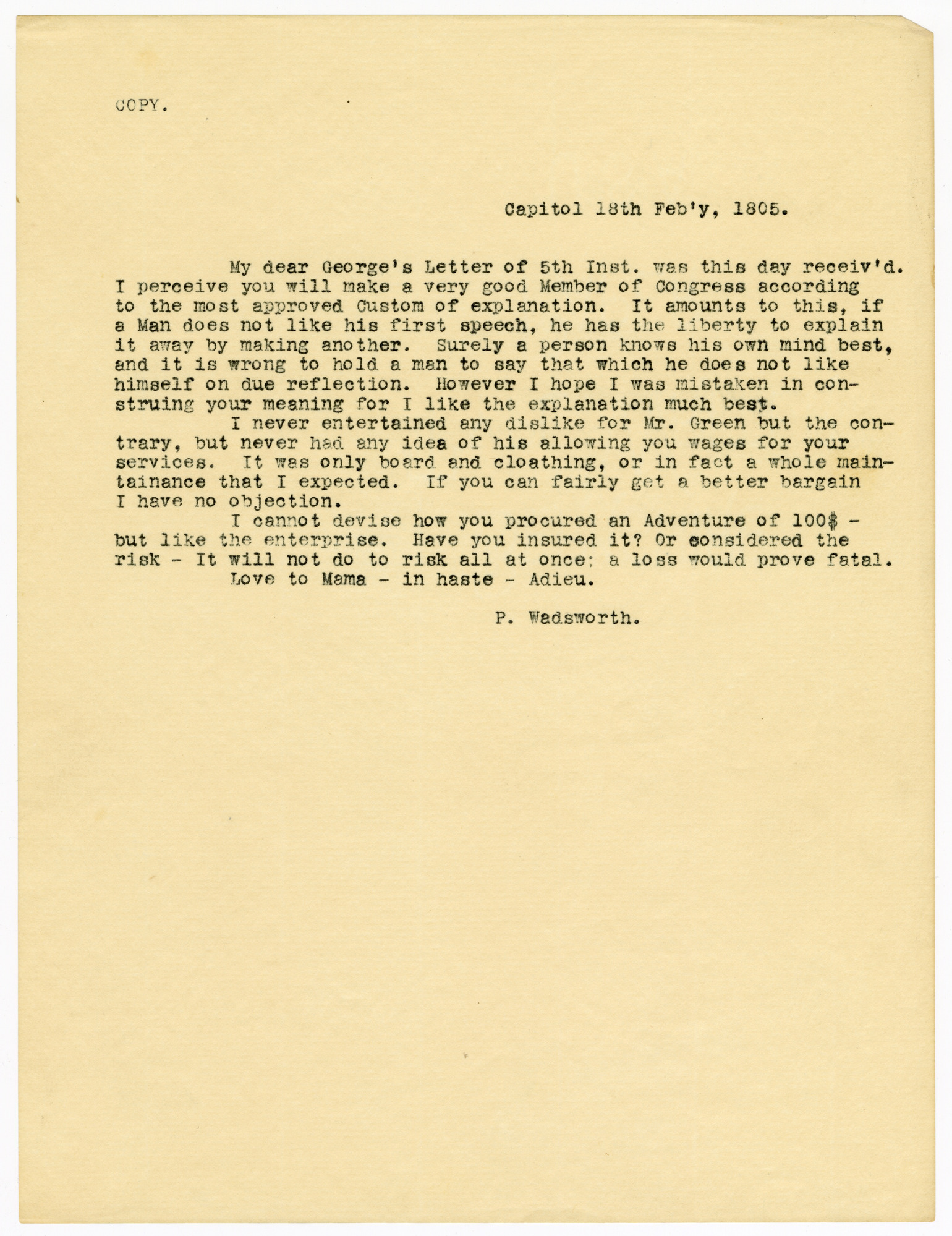 Manuscript letter in the Wadsworth-Longfellow Family Papers, Peleg Wadsworth and Family Papers, Peleg Wadsworth Papers, Correspondence, Outgoing, 1805. (1005/4.1.1-12#13)