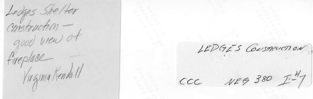 Construction of Ledges Shelter by Civilian Conservation Corps ca. 1934. See scan of writing on the back of each image for additional details. || Many of the historic structures in the Virginia Kendall unit of Cuyahoga Valley National Park were built by Civilian Conservation Corps workers during the 1930s.