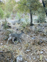 a young grey deer walks through the Arizona forest with trees, agave plants and rocks around its feet