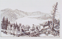 The John Wesley Hillman Party, with pack mules on the rim of Crater Lake on the day of its discovery, June 12, 1853. The party of prospectors erected a crude sign bearing their signatures, and named the majestic waters, "Deep Blue Lake."