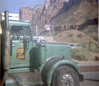 Front of 'Arizona Refining Company' truck with flag in background during sealcoating of parking area in Zion. ; ZION Museum and Archives Image 002.12.08-9of9 ; ZION 15933