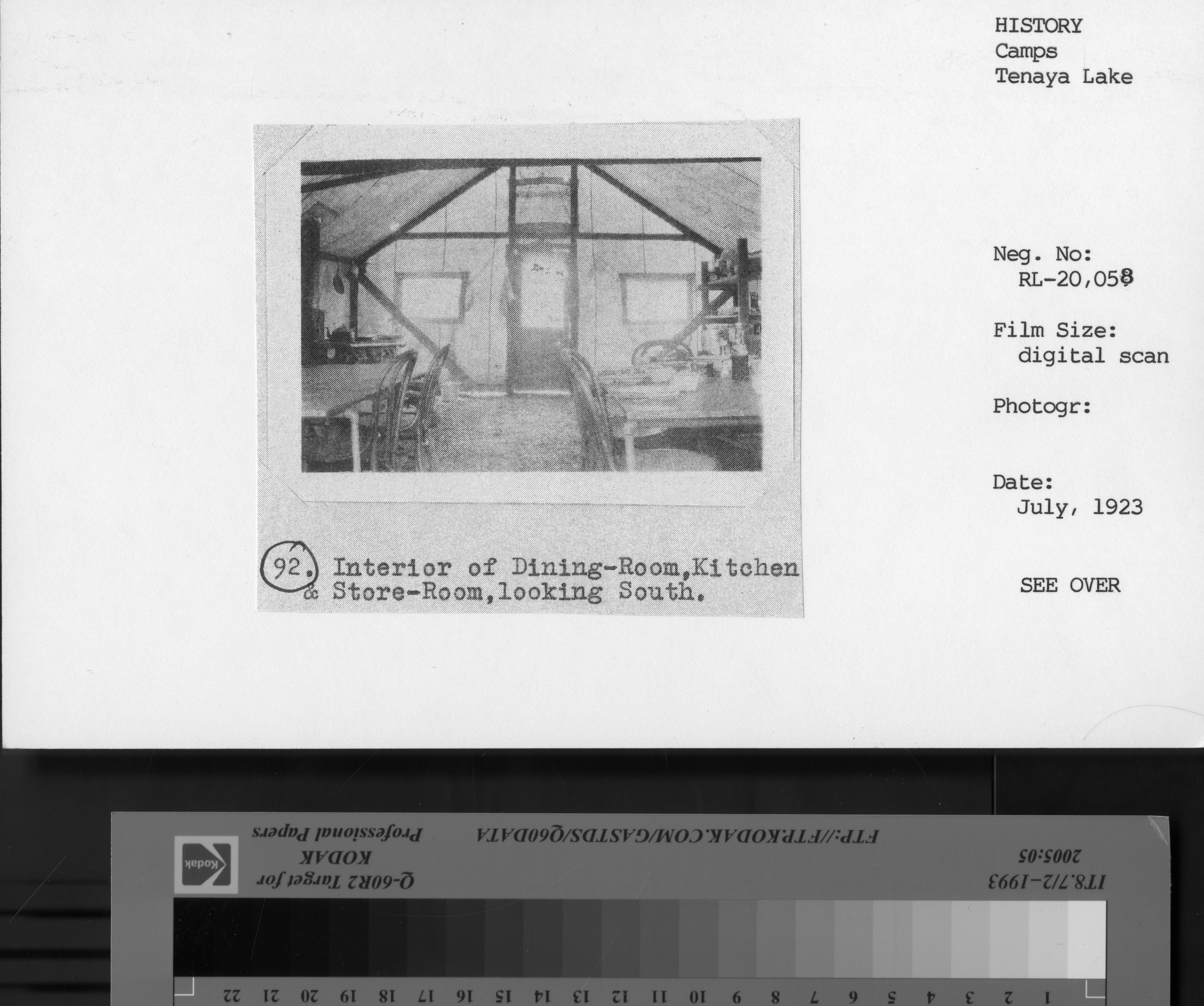 Scanned from insurance appraisal photo books taken prior to concession company merger. July 1923. #92 Interior of Dining Room, Kitchern & Store Room, looking South. Hikers Camp, Tenaya Lake.