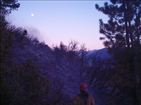 The North Fire was ignited by lightning on August 21, 2004, and was discovered the next day by a park fire engine crew stationed in nearby Cedar Grove. After three days of burning, the fire was showing potential to spread downslope toward the Cedar Grove development in the bottom of Kings Canyon, so containment action was taken along the west flank of fire to control that downslope movement. A total of four acres burned. These images, taken by SEKI Fire Monitoring Crew, show vegetation before, during and after the burn and views of sundown and moonrise over the Great Western Divide.