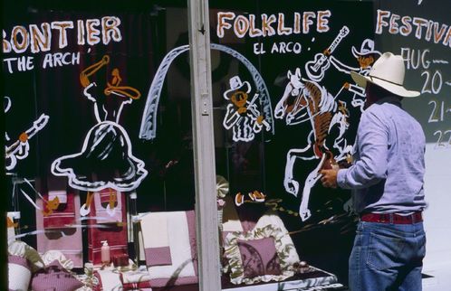 Glenn Ohrlin, painting a window mural. ; August 1982